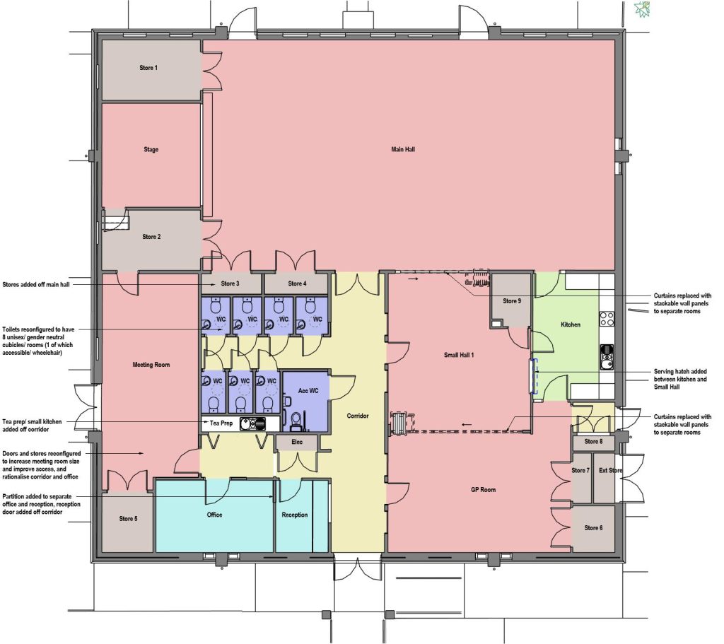 The plan above shows the changes proposed to the community centre, having taken on board the excellent feedback received in recent months. We hope the changes will improve the centre, increase flexibility for hall users, and futureproof the centre for many years to come.